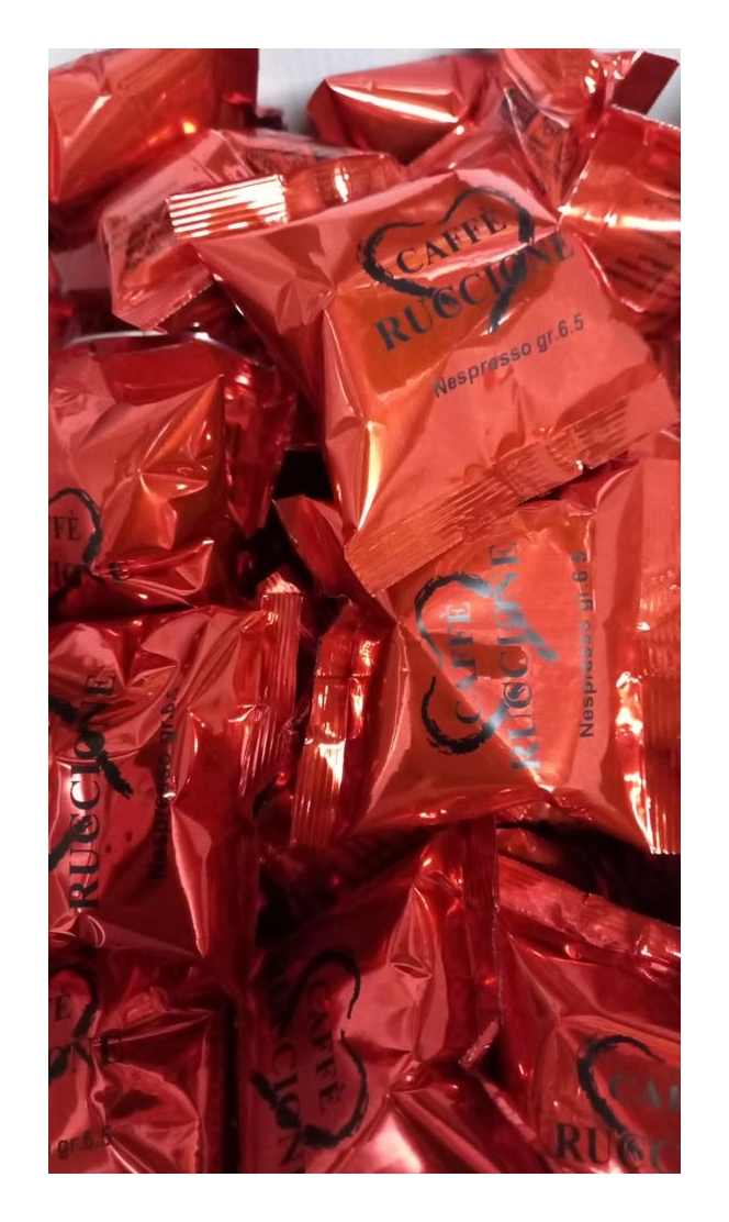 Caffè Ruccione , 100 Capsule compatibili Nespresso Rosso. Miscela forte e decisa molto corposa retrogusto di Cacao. Miscele di caffè pregiate selezionate, torrefatto artigianalmente con cura e confezionati senza procedimenti industriali. Confezione maxi da 100 capsule è il formato ideale per chi ama il caffè e non vuole mai restare senza. I nostri migliori chicchi di caffè vengono lavorati con grande cura in ambiente protetto, per lasciare che si esprimano il massimo di sé in un prodotto cremoso dal gusto intenso e aromatico.