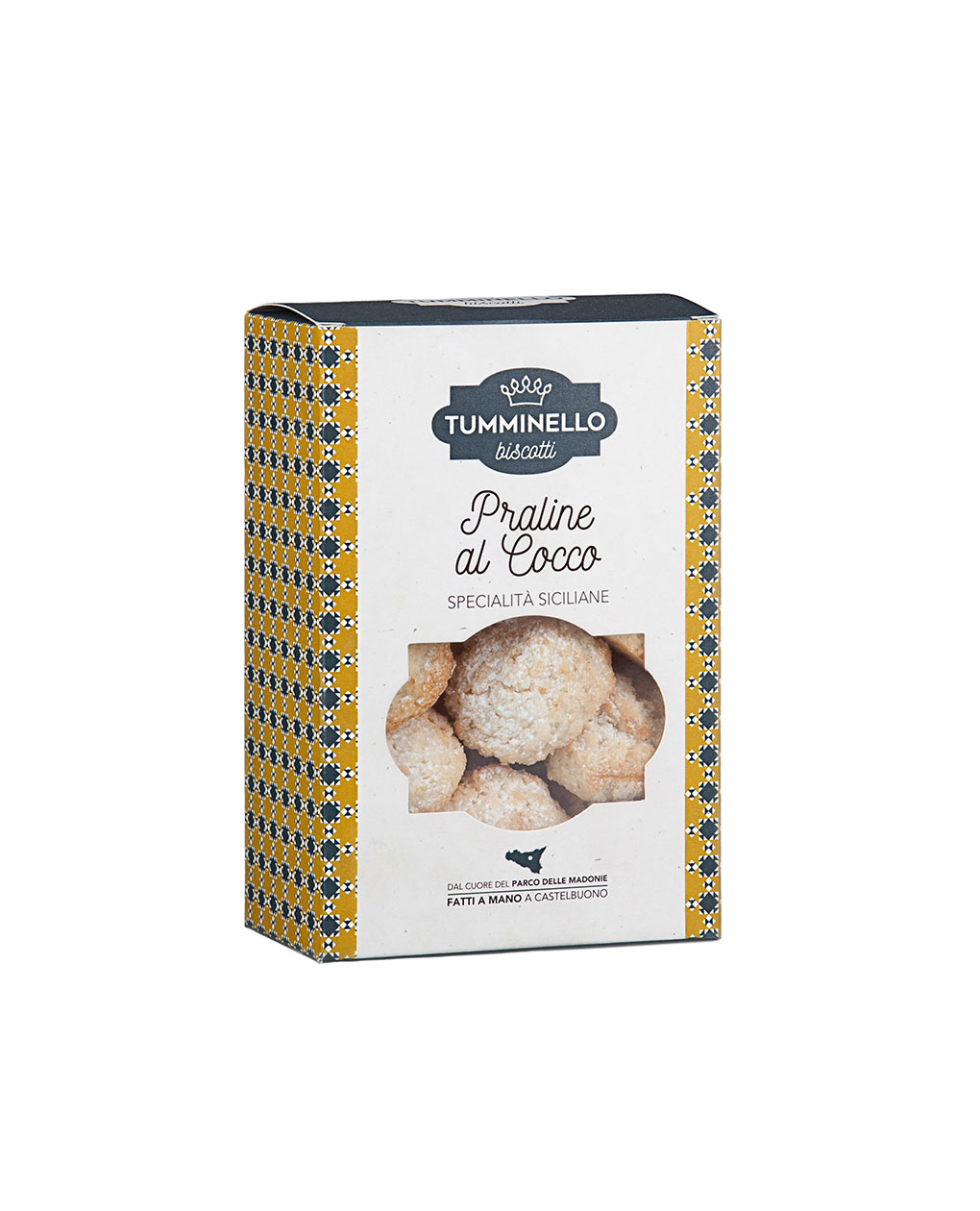 Ingredienti: farina di cocco 32%, zucchero, albume di uovo, mandorle siciliane tritate 16%, miele millefiori, dolcificante: sorbitolo, conservante: sorbato di potassio.