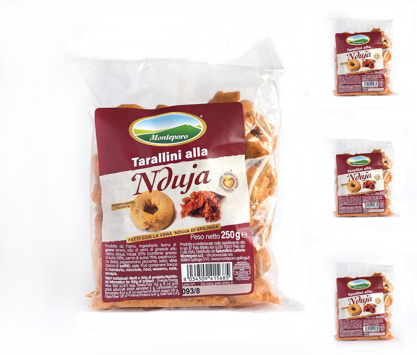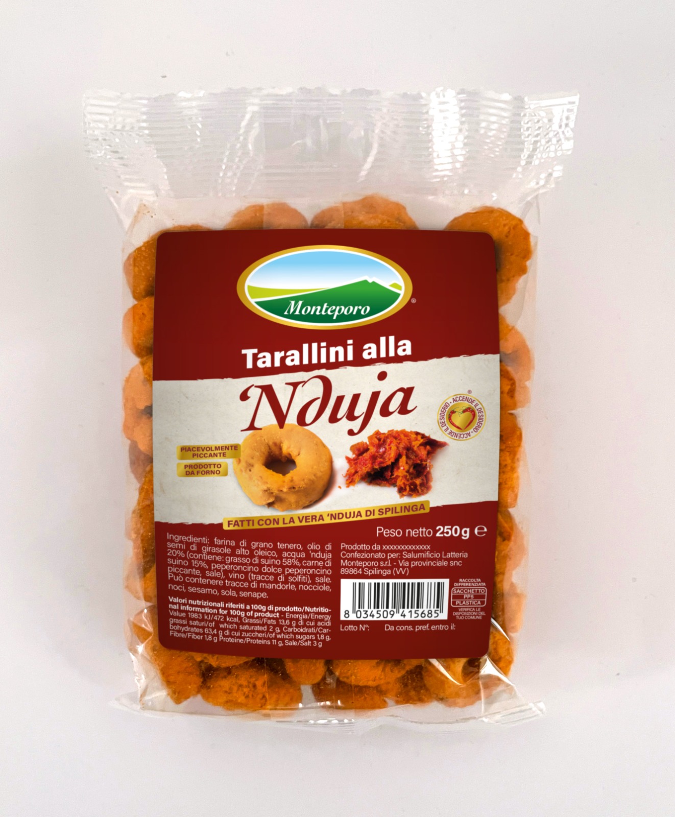 I Tarallini alla Nduja di Spilinga sono perfetti per aperitivi o semplicemente come uno snack tra una pausa e l’altra. Piacevolmente piccanti e cotti al forno.Ingredienti:farina di grano tenero, olio di semi di girasole alto oleico, acqua, nduja 20% (contiene: grasso di suino 58%, carne di suino 15%, peperoncino dolce, peperoncino piccante, sale) vino (tracce di solfiti), sale.Può contenere tracce di mandorle, nocciole, semi, sesamo, soia, senape.Peso: 250g